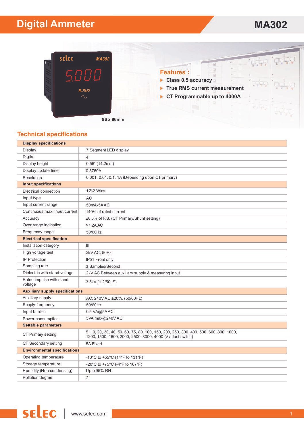 The Selec MA302 is a high-precision, true-RMS digital ammeter designed for reliable current monitoring in single-phase electrical systems. With its 96 × 96 mm panel-mount form factor and bright 4-digit 7-segment LED display, the MA302 offers a compact, easy-to-read solution for industrial and commercial electrical installations. selec.com+2miaenterprises.in+2